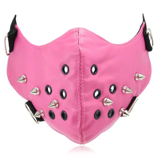 Rosa lädermask med nitar och ringdetaljer