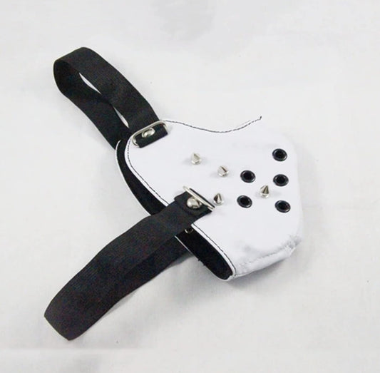 Vit lädermask med nitar och justerbara remmar