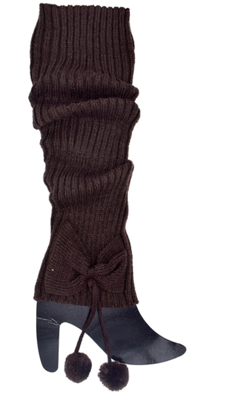 Tummanruskeat säärenlämmittimet rusetilla ja palloilla