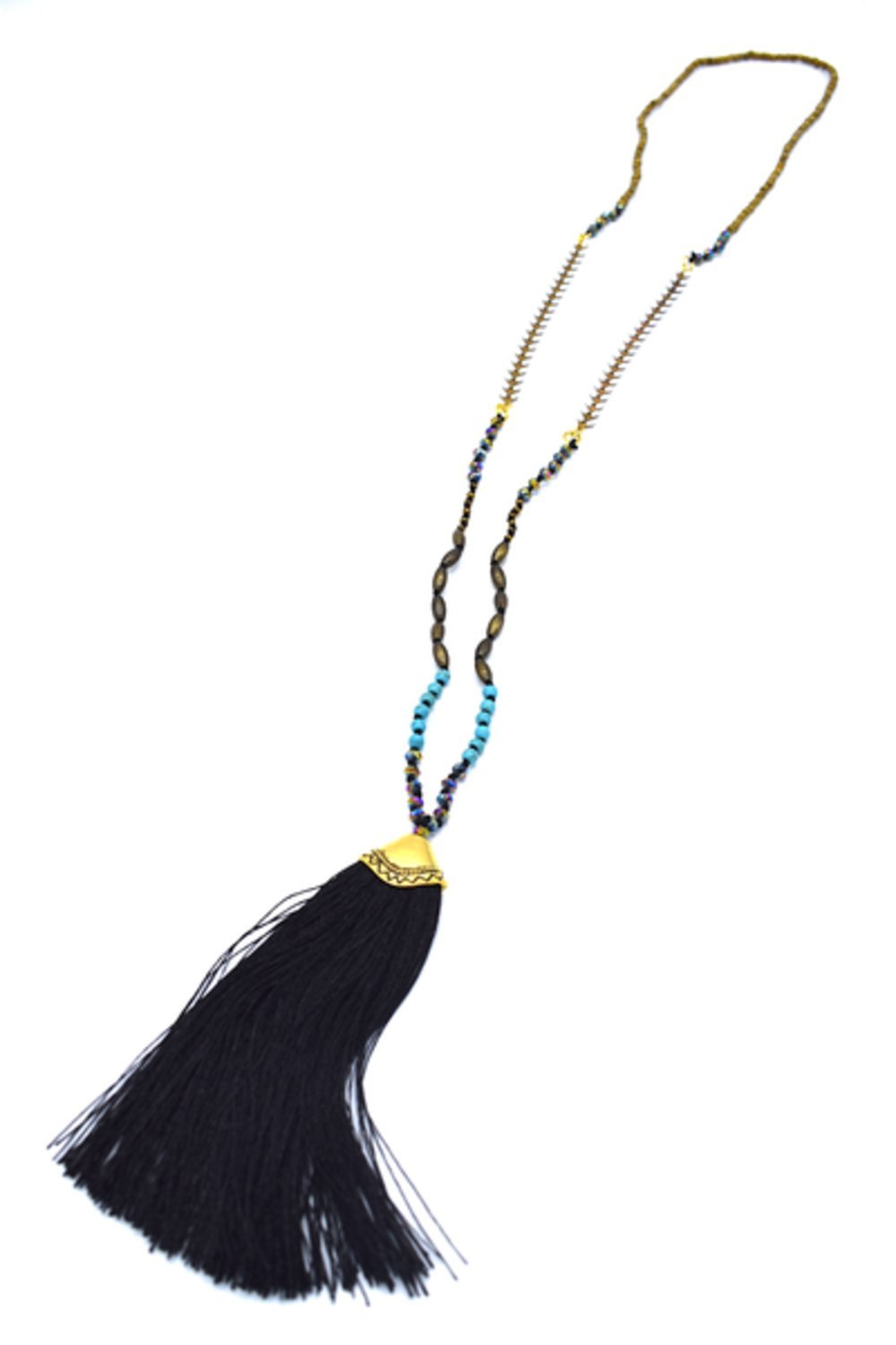 Pitkä kaulakoru, jossa on useita erilaisia värikkäitä helmiä ja tyylikäs riipus hapsuilla.