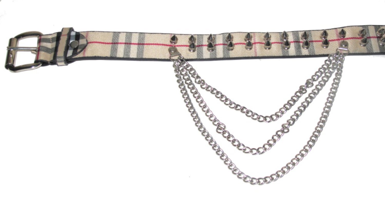 Kuvioitu vyö, jossa hopeiset niitit ja 3 ketjua