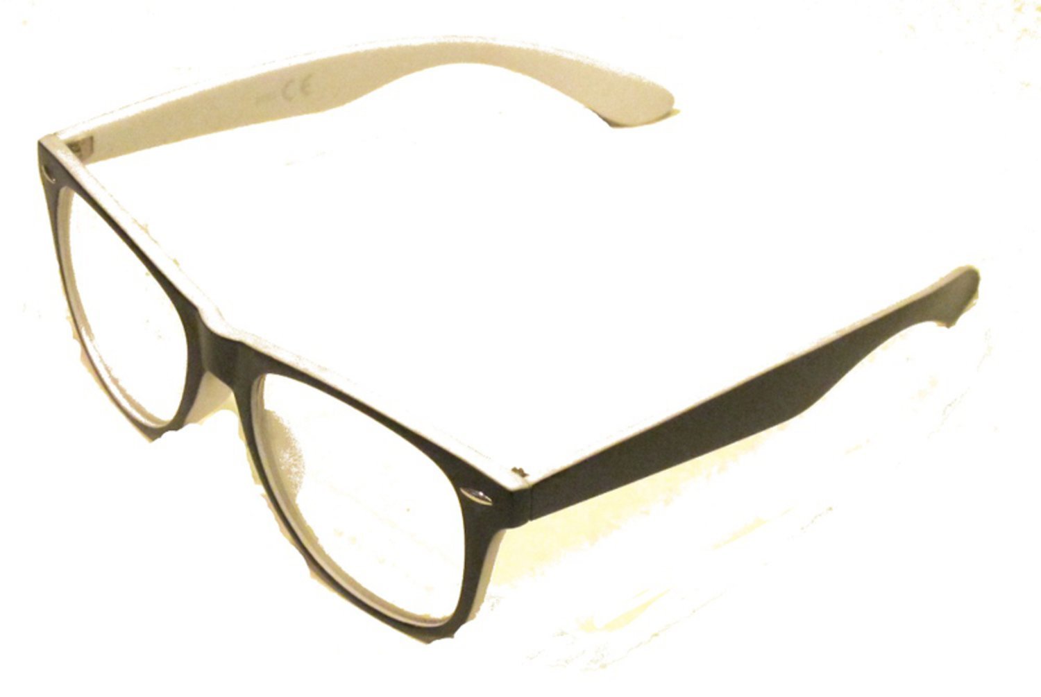 Lasit läpinäkyvillä linsseillä ja mustat valkoisilla kehyksillä