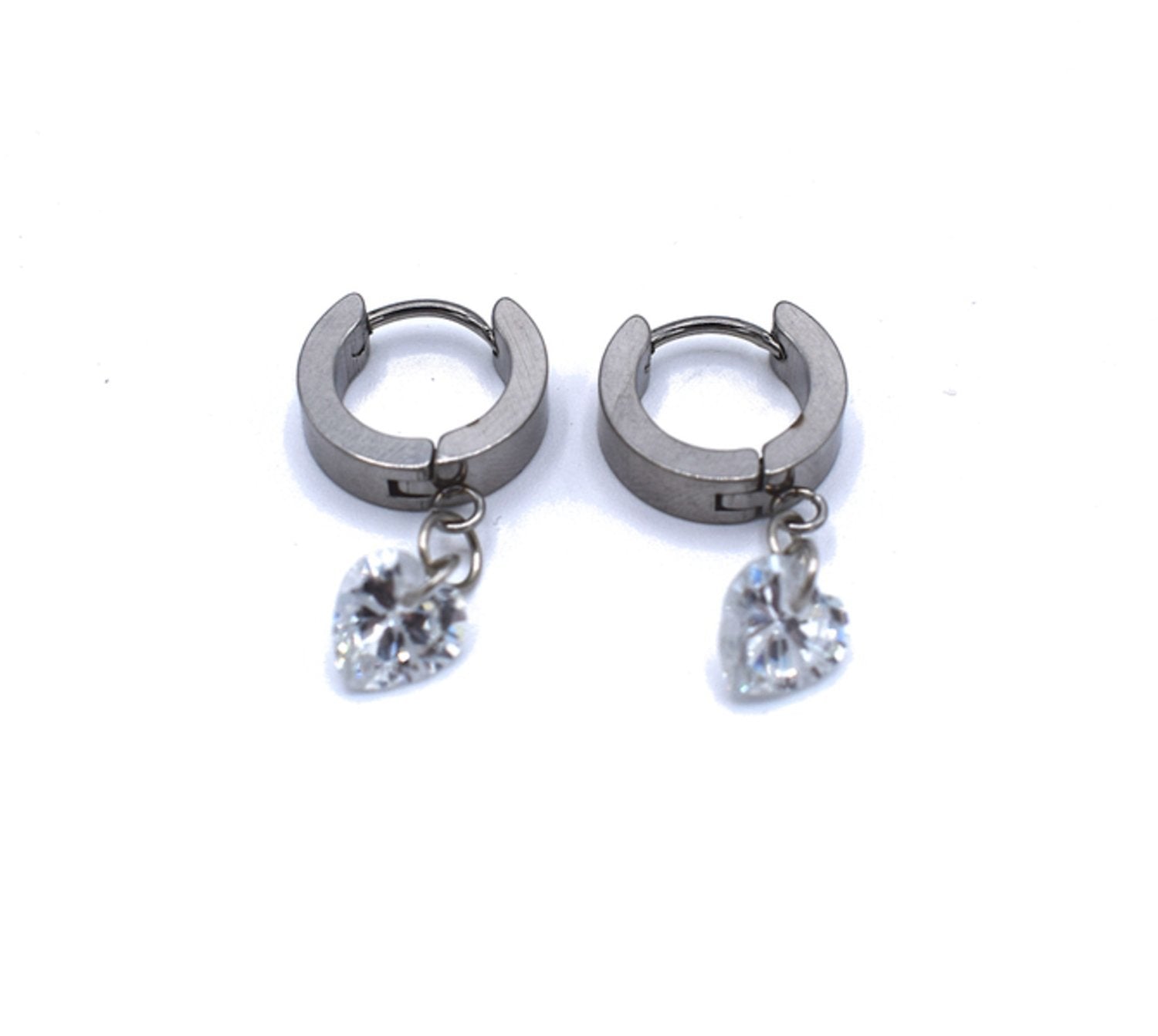 Hopeanväriset korvakorut, joissa sydämen muotoinen valkoinen kristalli.