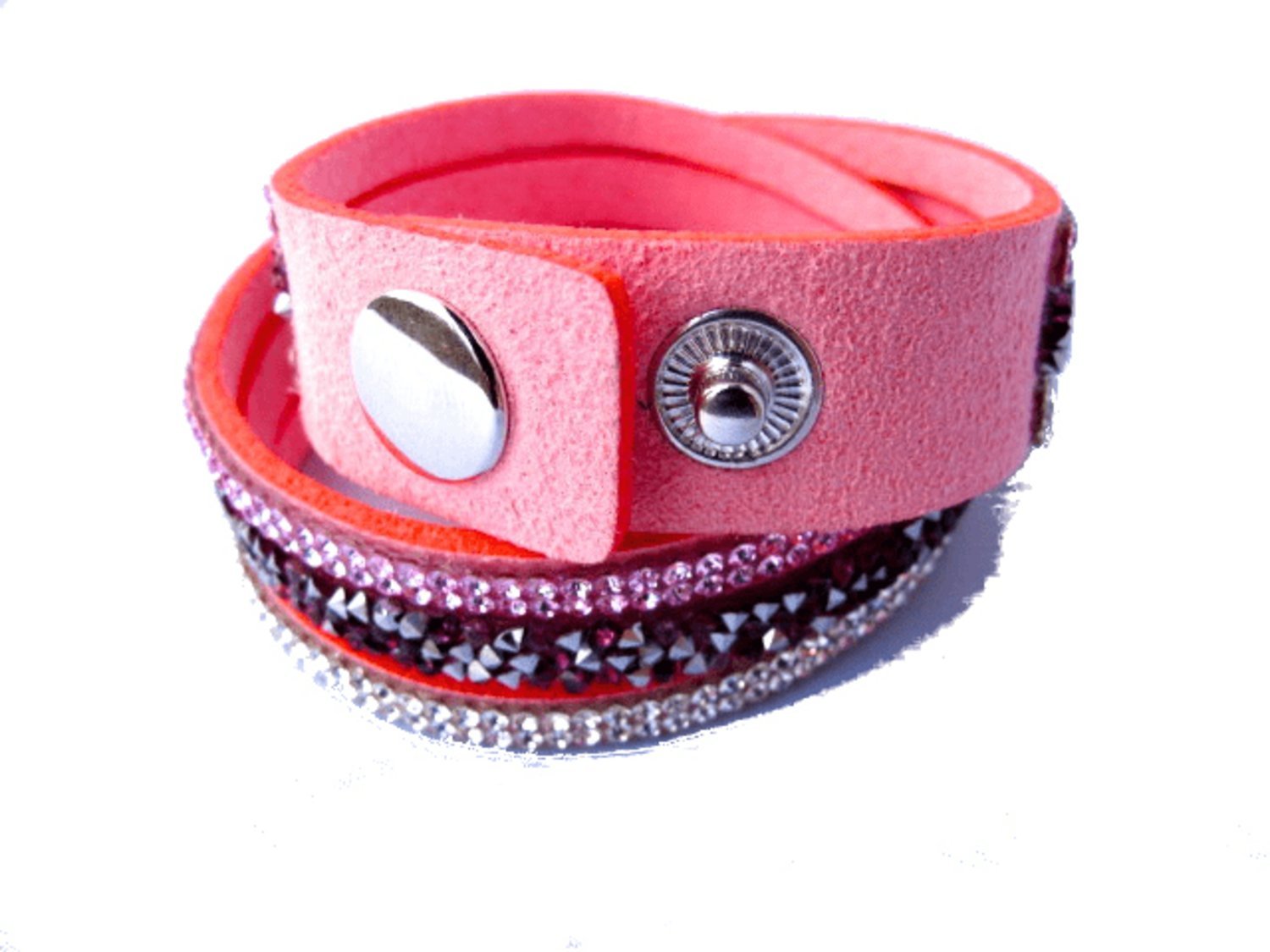 Vaaleanpunainen kaksinkertainen nahkarannekoru kristalleilla