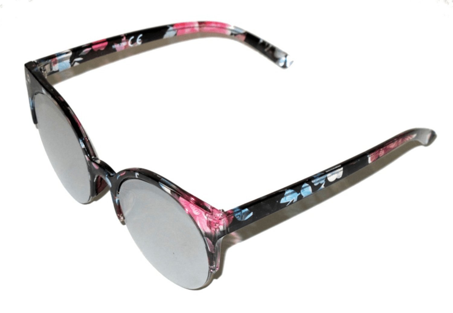 Pyöreät aurinkolasit, joissa peililinssit ja kukkakehys.