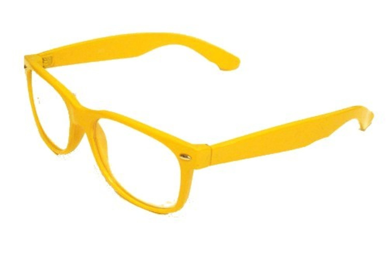 Aurinkolasit läpinäkyvillä linsseillä ja keltaisilla kehyksillä