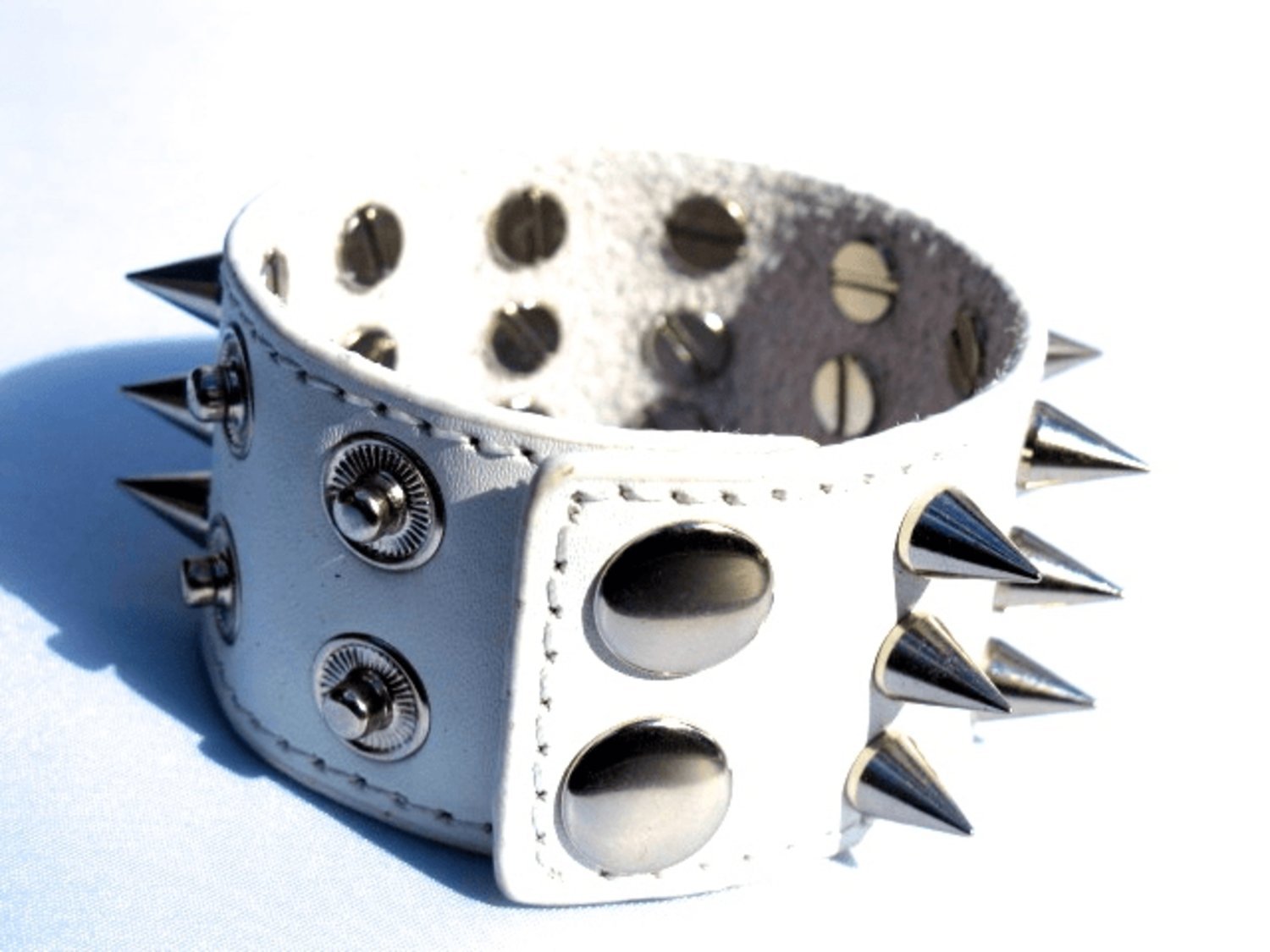 Valkoinen nahkaranneke hopeisilla niiteillä
