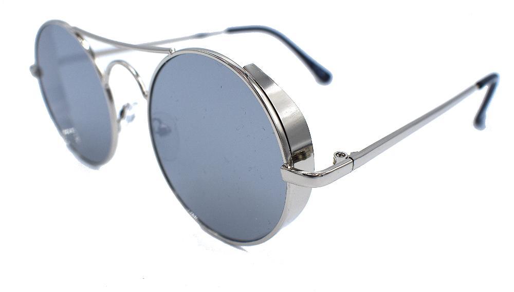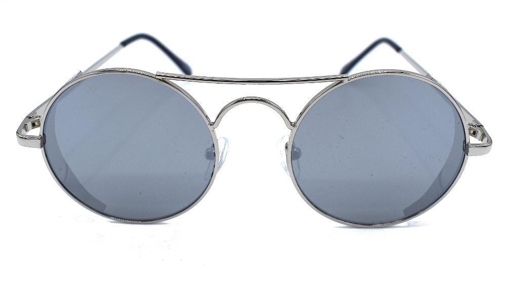 Pyöreät aurinkolasit hopeanvärisillä kehyksillä ja peililinsseillä.