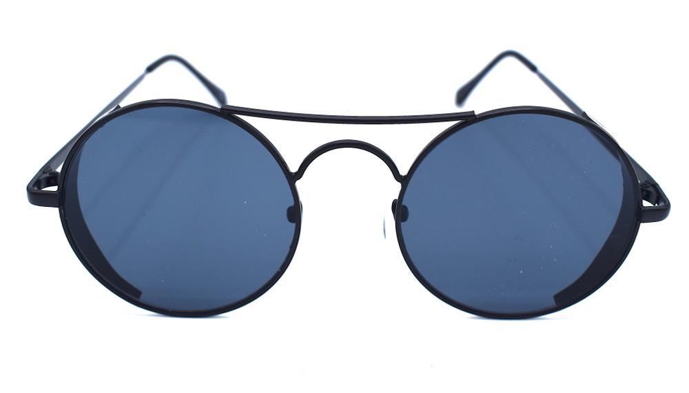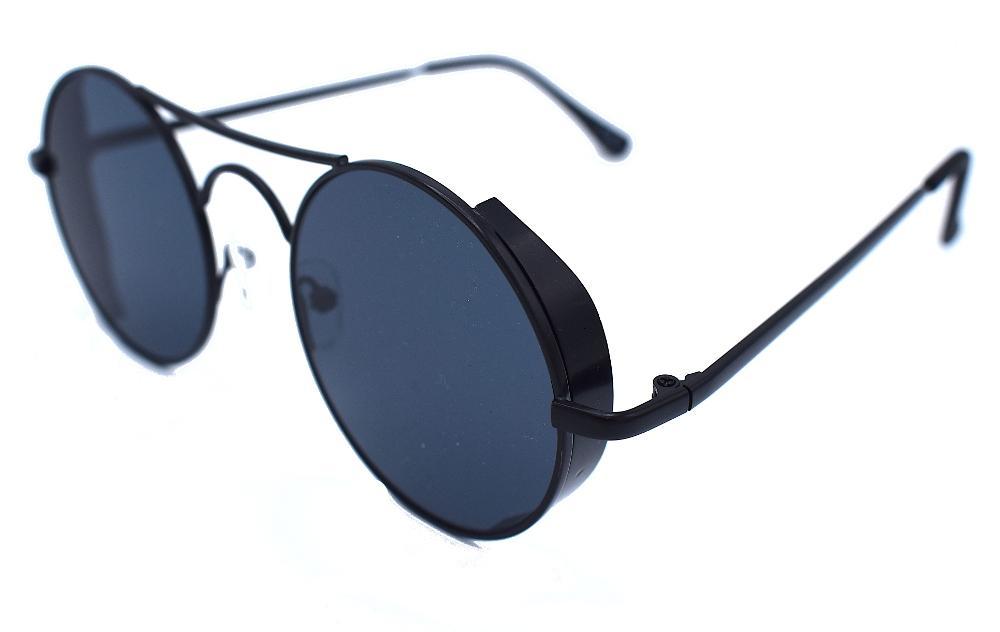 Pyöreät aurinkolasit mustilla kehyksillä ja mustilla linsseillä.