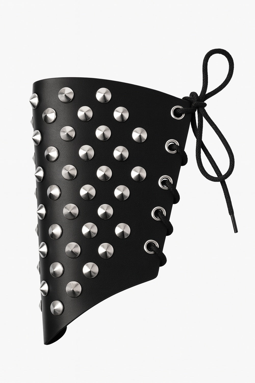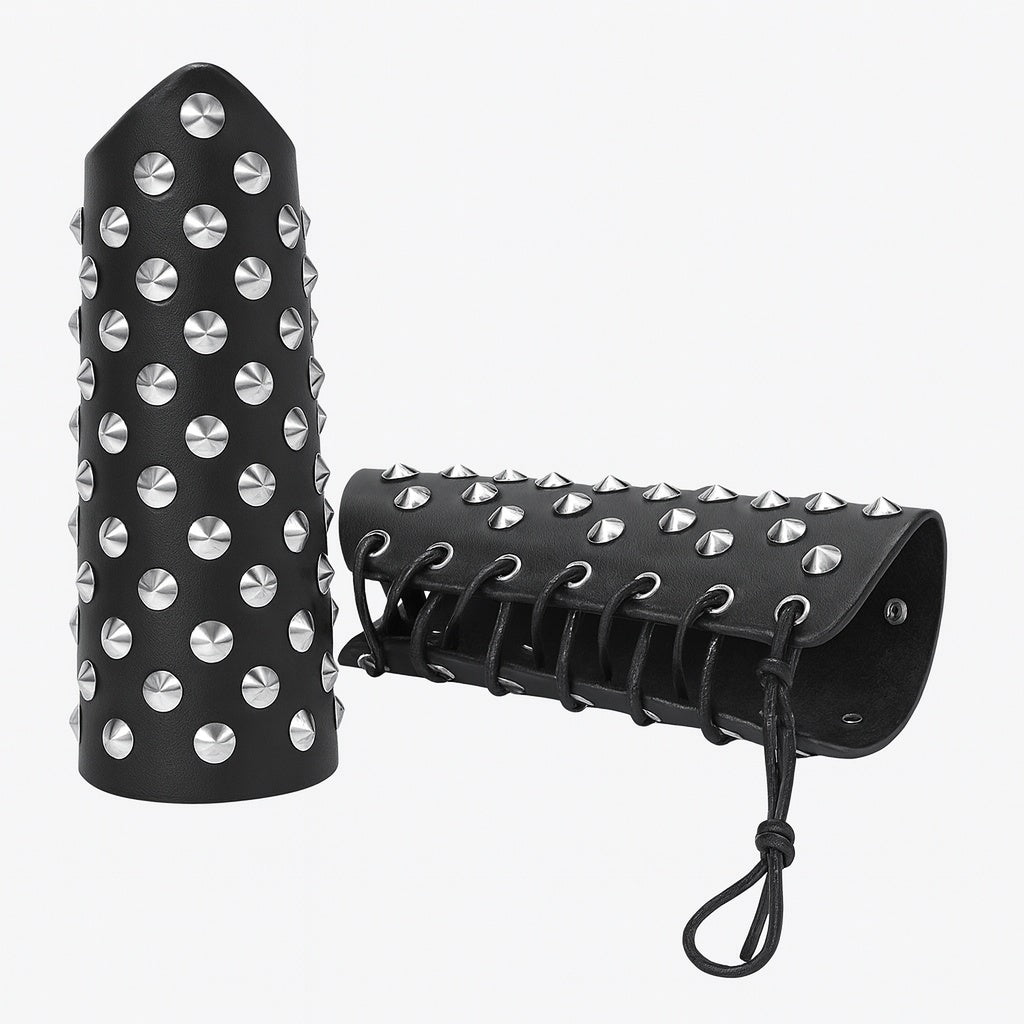 Kraftfullt och stilfullt brett armband i svart konstläder, helt täckt med silverfärgade nitar för en tuff och rockig look. Armbandet är justerbart med snörning på baksidan, vilket gör att det passar de flesta handleder och underarmar. Perfekt för konserter, festivaler, cosplay eller för att ge vardagsstilen extra attityd.