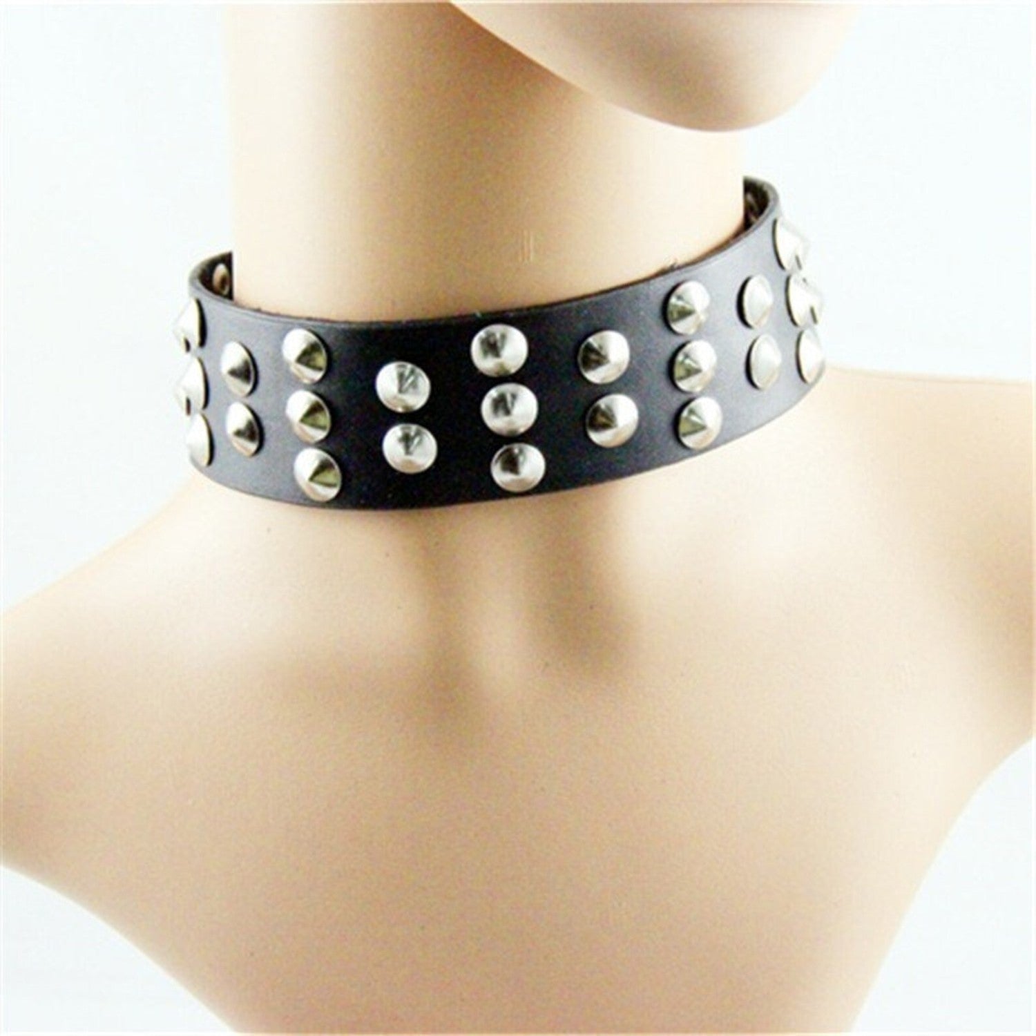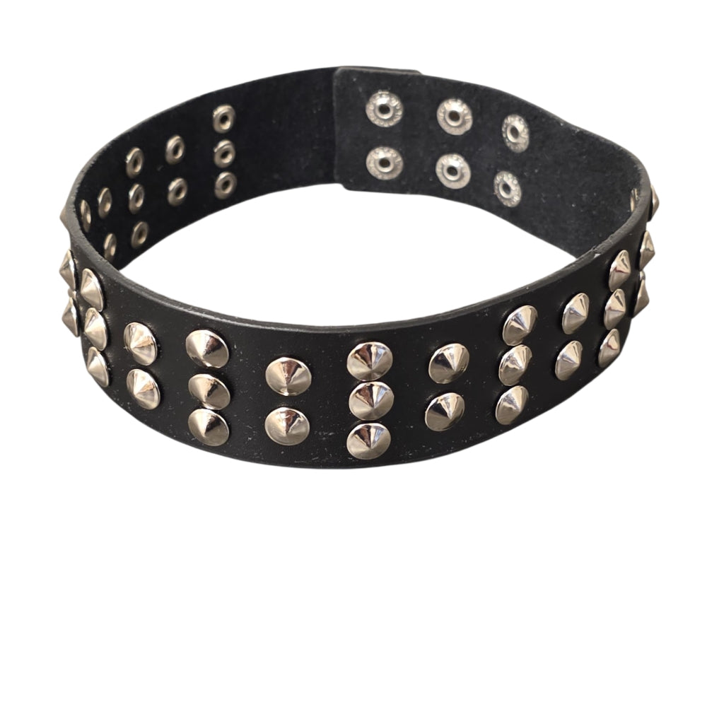 Denna svarta choker är dekorerad med dubbla rader silverfärgade nitar som ger ett kraftfullt och rockigt uttryck. Med sin breda design blir den en riktig statement-accessoar som passar perfekt till både alternativa outfits och scenframträdanden.
