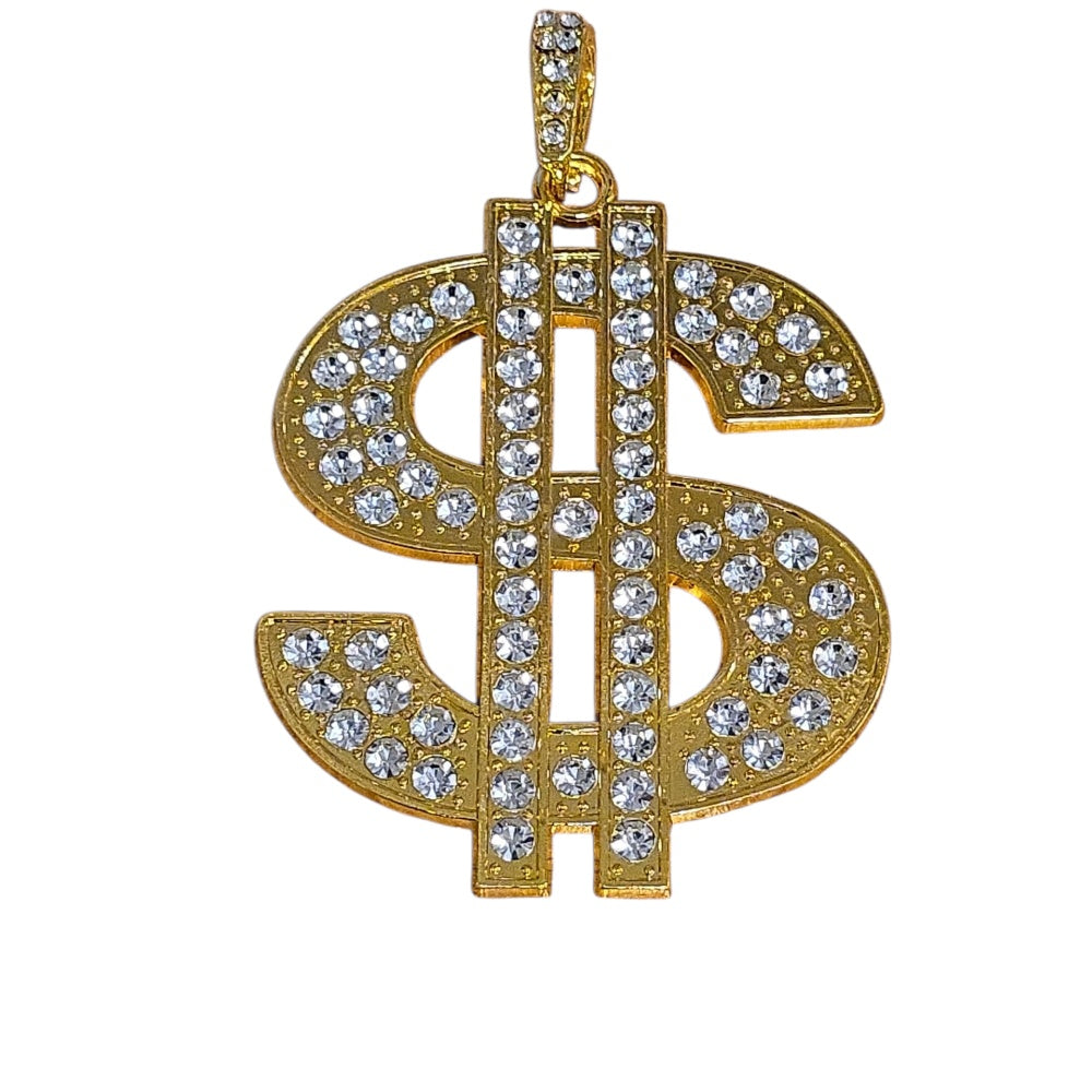Gör ett riktigt statement med detta guldiga halsband med stort, gnistrande dollarhänge. Hänget är ca 6 x 6 cm och prytt med klara stenar som ger en lyxig och iögonfallande look. Kedjan är ca 36 cm lång och har en klassisk design som kompletterar hängets glittrande stil. Perfekt för party, scenframträdanden eller för dig som vill sticka ut i mängden.