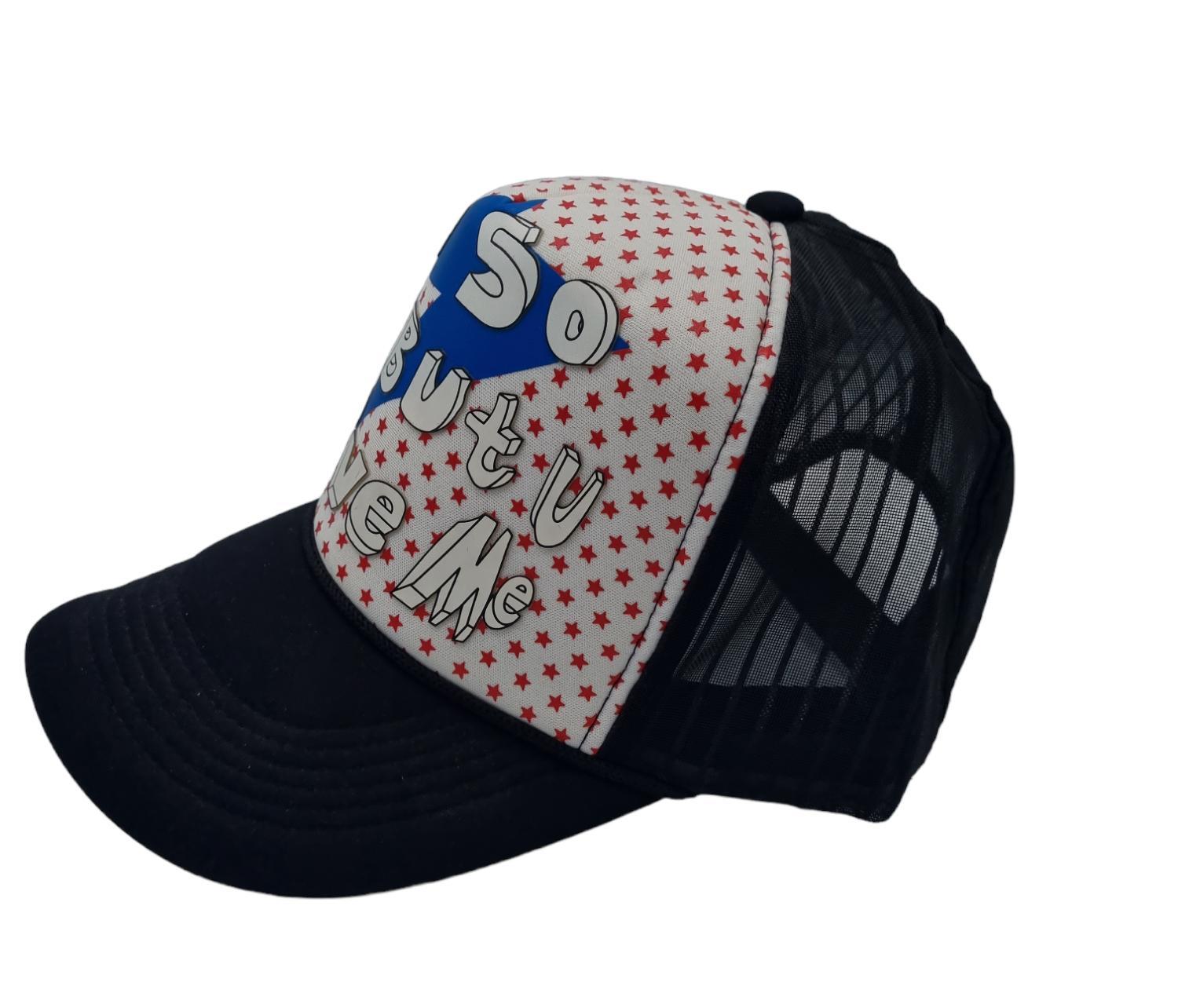 Black, white, blue and red mesh cap with the text "I Am so bad but U love Me"