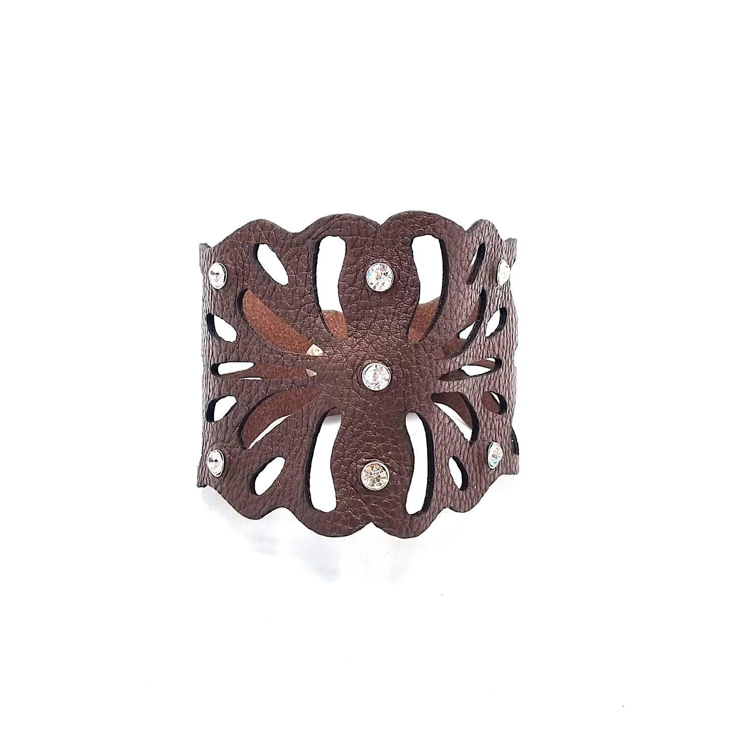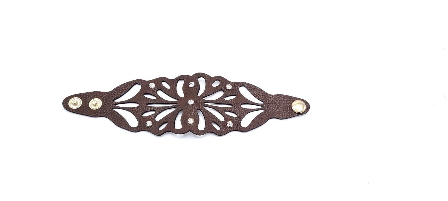 Patterned brown leather bracelet with rhinestones