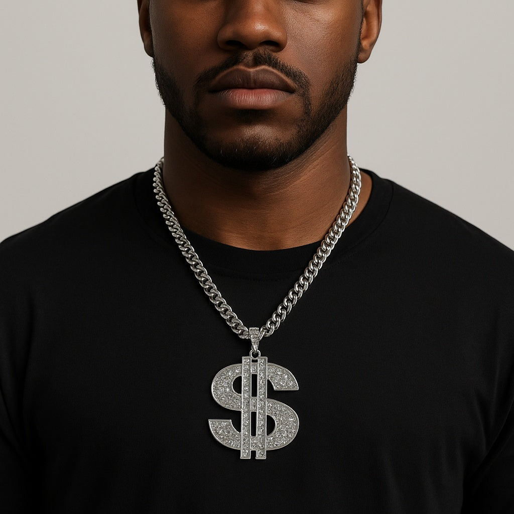Gör ett riktigt statement med detta silverfärgade halsband med stort, gnistrande dollarhänge. Hänget är ca 6 x 6 cm och prytt med klara stenar som ger en lyxig och iögonfallande look. Kedjan är ca 36 cm lång och har en klassisk design som kompletterar hängets glittrande stil. Perfekt för party, scenframträdanden eller för dig som vill sticka ut i mängden.