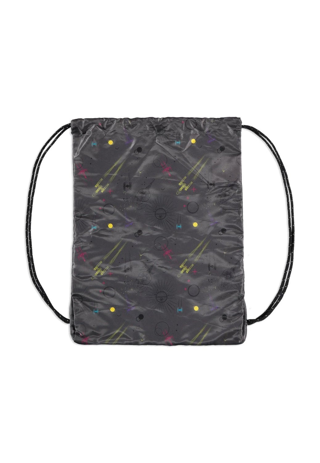 Bär galaxen med dig vart du än går med denna Star Wars-ryggsäck med dragsko. Med ett heltäckande sublimeringstryck av ikoniska Star Wars-rymdskepp, inklusive Millennium Falcon, X-wing och TIE-fighters, är denna ryggsäck perfekt för alla fans. Den kommer med praktiska dragsko, en extra ficka med dragkedja på framsidan och en meshficka för extra förvaring. Officiellt licensierad kombinerar denna väska funktionalitet med Star Wars-stil.