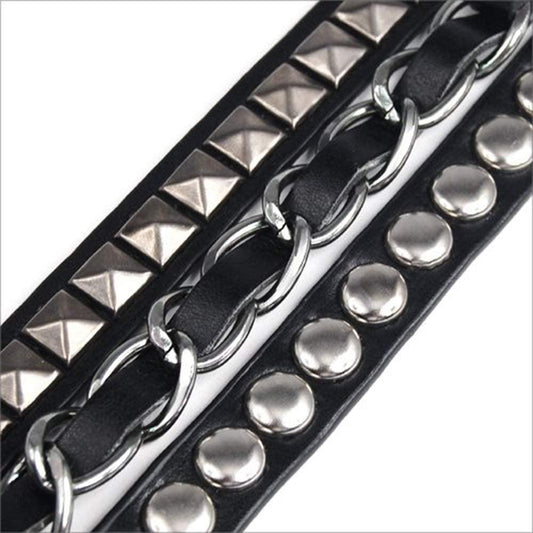 Läder armband med kedja, pyramid- och runda nitar