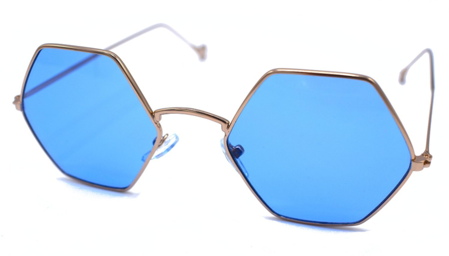 Halv transparent solglasögon med silverfärgade bågar och blåa linser från märket KOST.