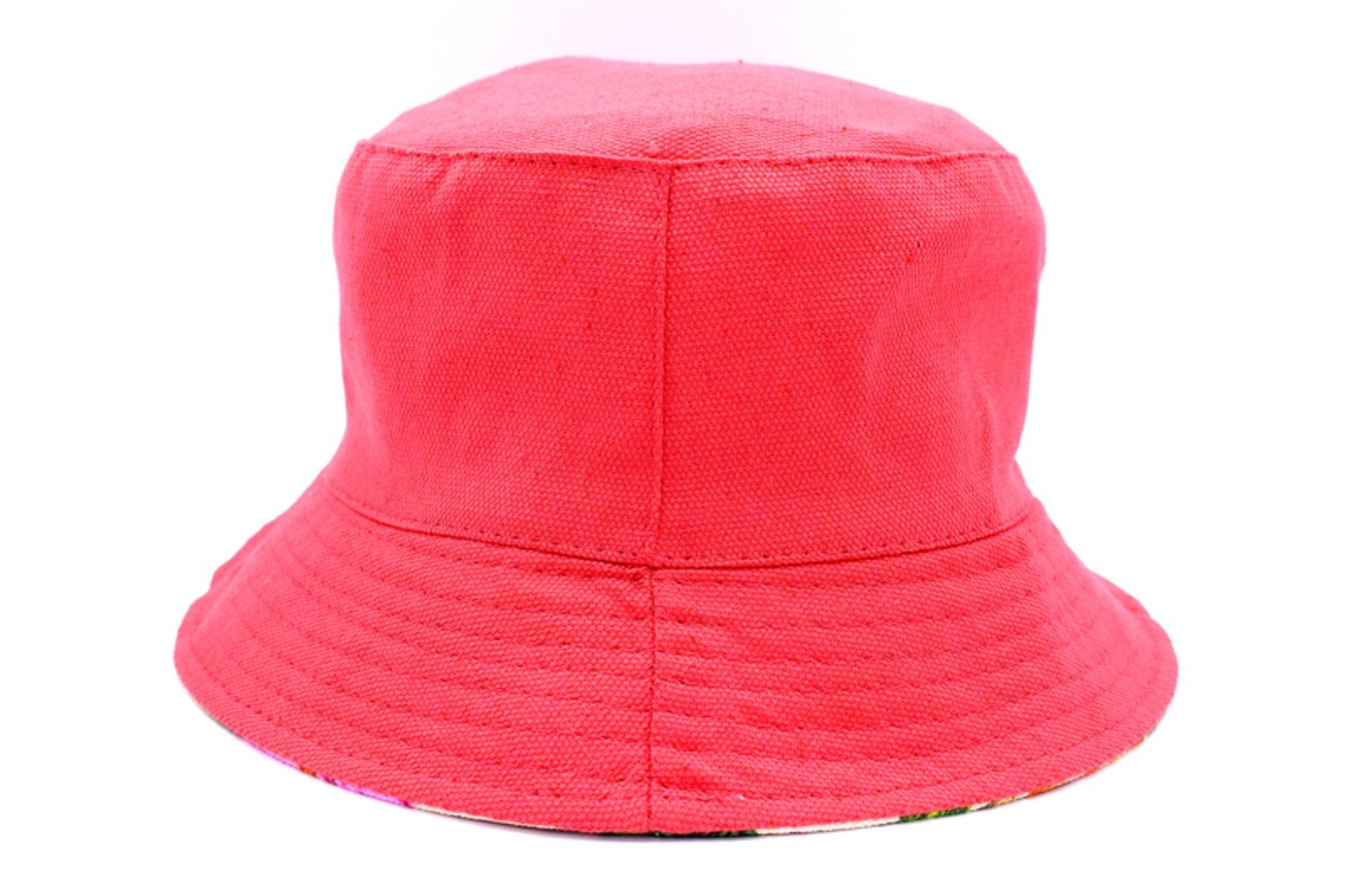 Fiskarmössa med färgglada blommor som motiv, vändbar för rosa färg.