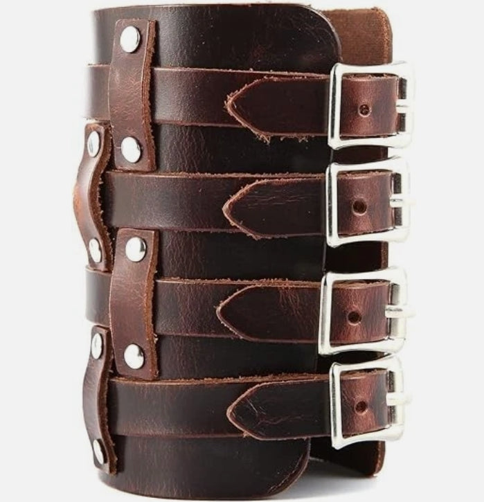 Lyft din stil med dessa breda bruna läderarmband som ger en rustik och kraftfull känsla. Tillverkade i slitstarkt konstläder med flera justerbara metallspännen för perfekt passform. Den klassiska designen passar både rock-, punk- och gothstil, men även till cosplay, medeltidsinspirerade outfits eller vardagsbruk för dig som vill sticka ut.