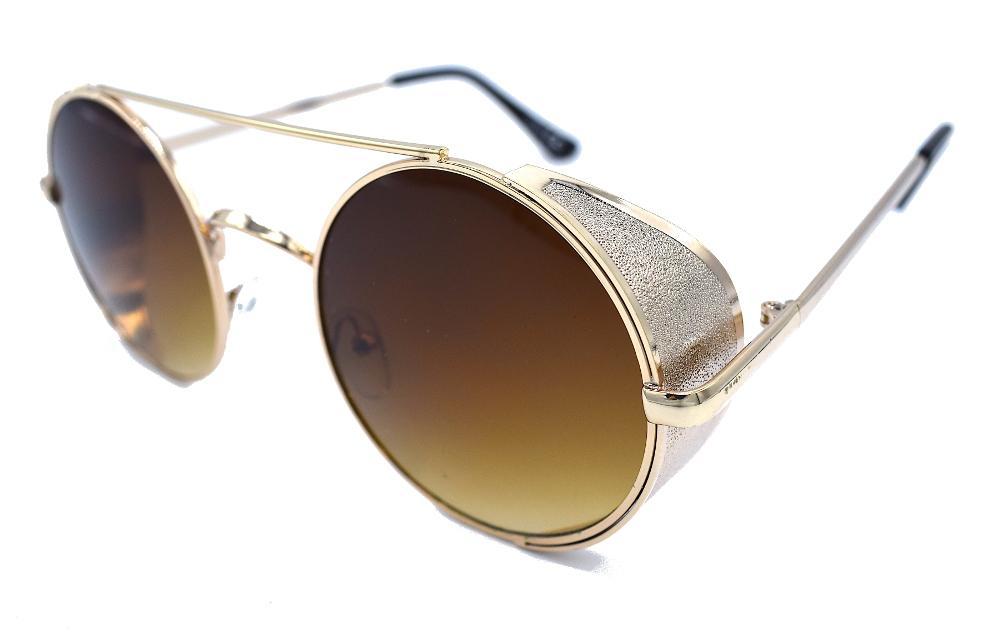 Runda solglasögon med silverfärgade bågar och bruna linser.