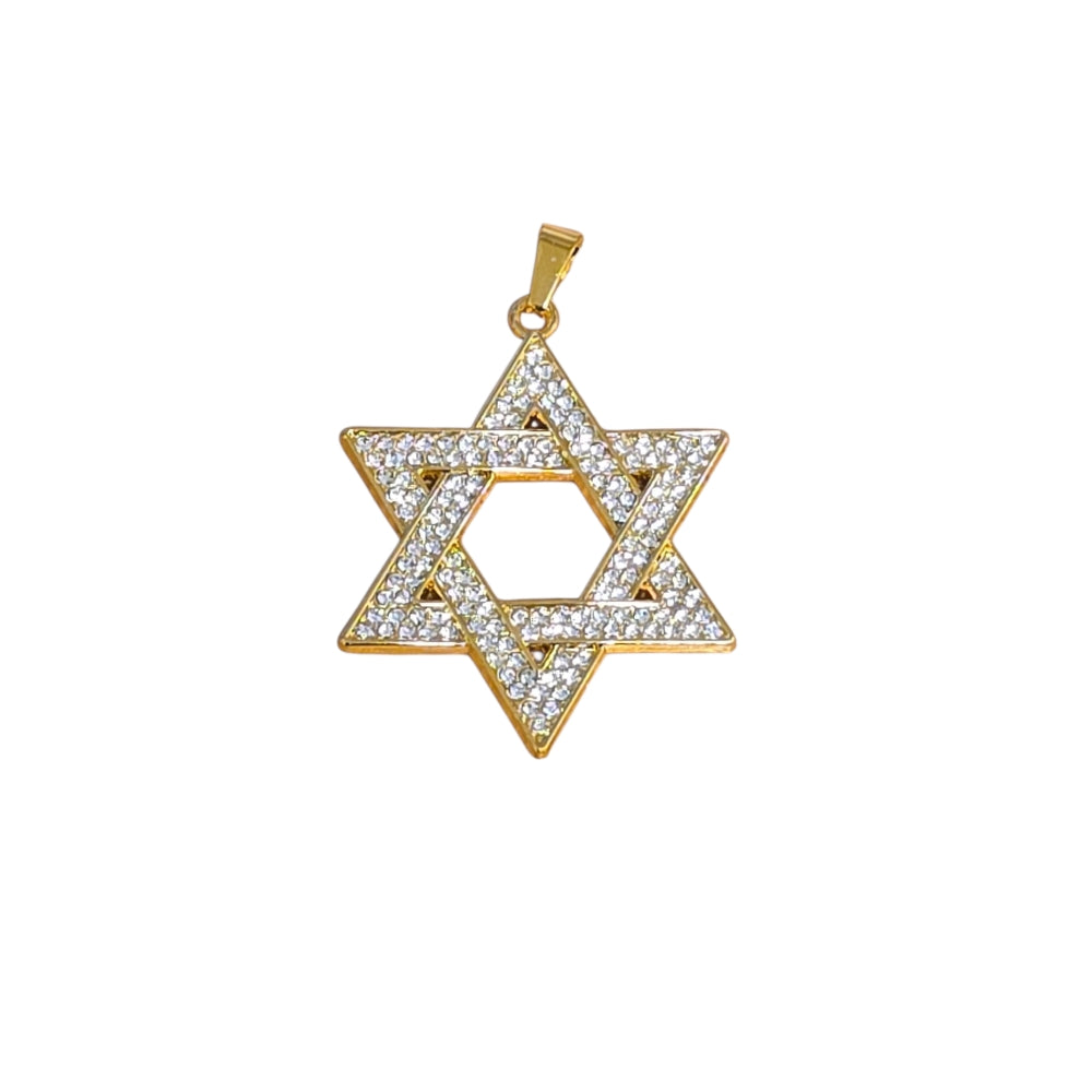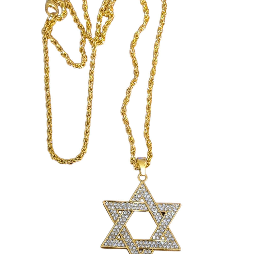 Exklusivt halsband med ett gnistrande hänge i form av Davidsstjärnan i guldfärgad design, täckt med klara stenar som ger ett lyxigt och elegant intryck. Hänget är 4 cm långt och 3 cm brett, vilket gör det lagom stort för att synas utan att kännas överdrivet. Kedjan är 60 cm lång och matchar perfekt i guldfärgat utförande.