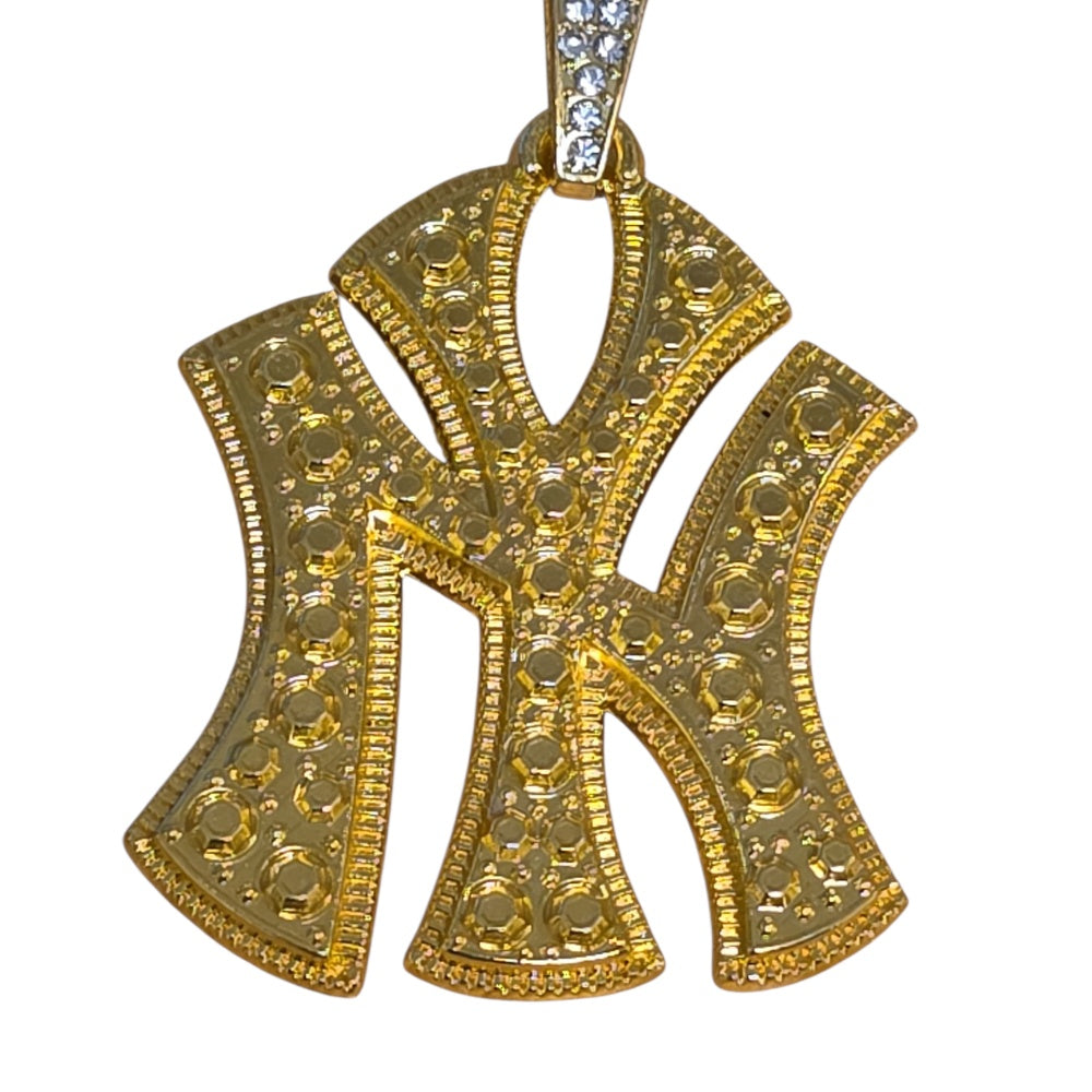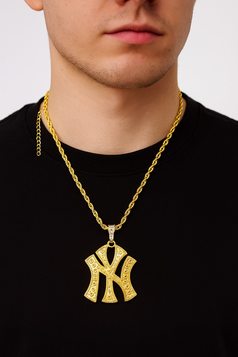 Exklusivt guldigt halsband med ett stort hänge i form av bokstäverna NY, dekorerat med glittrande stenar för en lyxig och iögonfallande look. Hänget är ca 5 cm brett och 7 cm långt, vilket gör det till ett riktigt statement-smycke. Kedjan är ca 55 cm lång och har en vriden design som kompletterar hänget perfekt. En must-have för dig som gillar streetstyle, hiphop och bling.