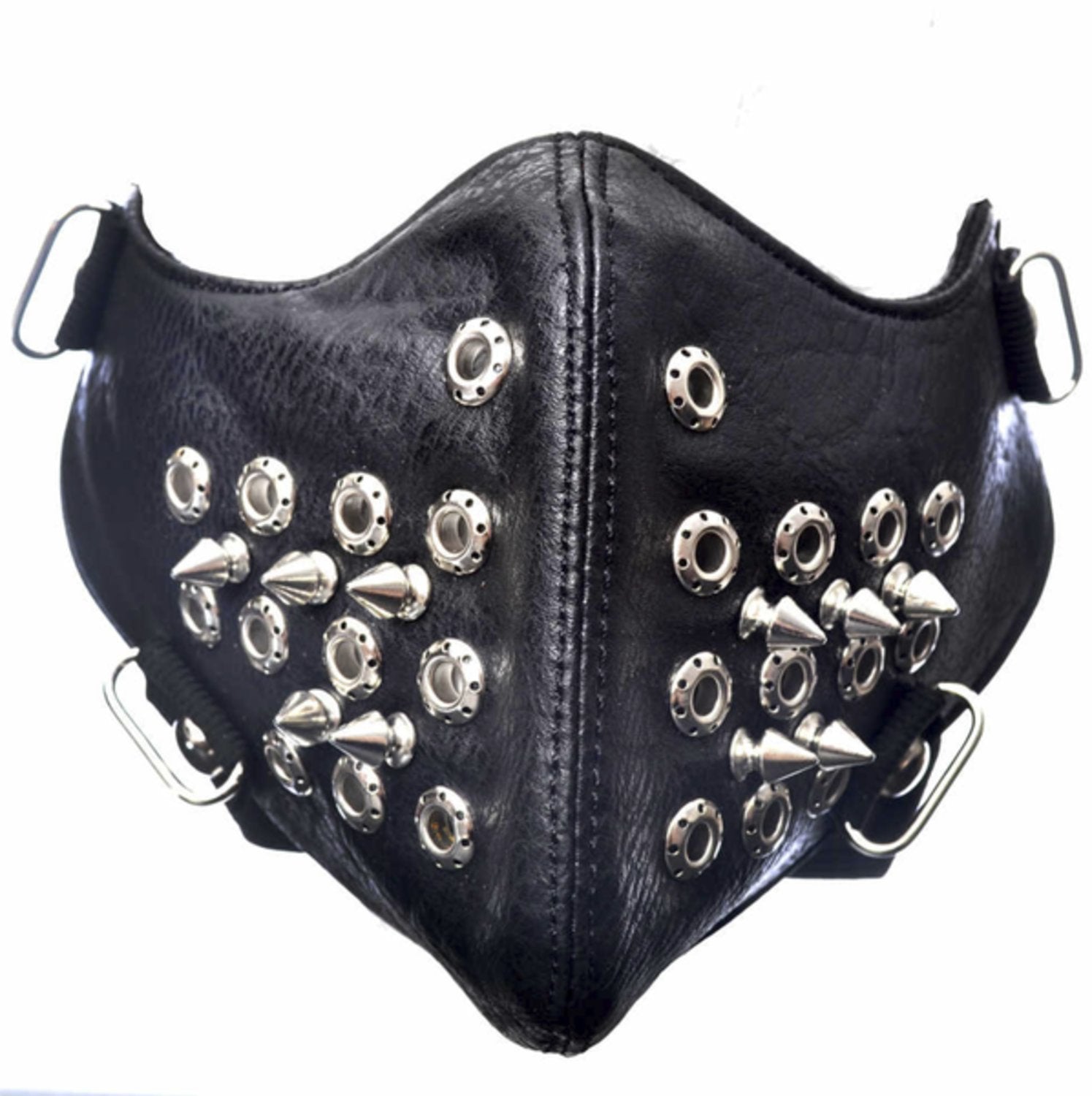 En edgy mask i svart konstläder med perforerade ringar och längre, konformade spikes. Mjuk insida och justerbara remmar gör den bekväm och stabil. Passar cosplay, festival, scen och fotosessioner.
