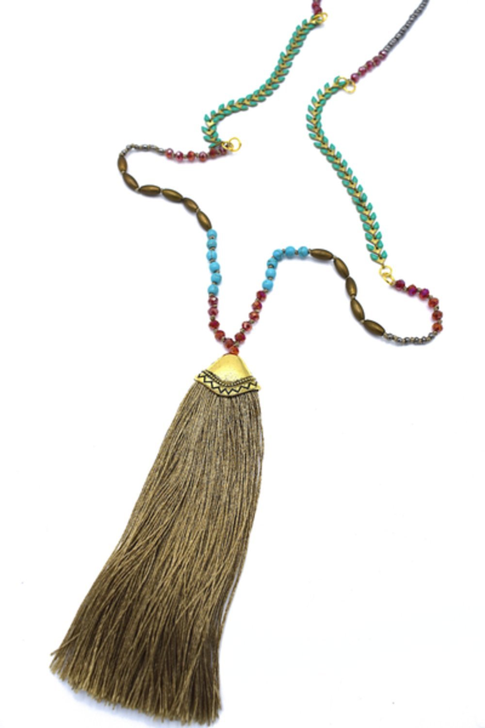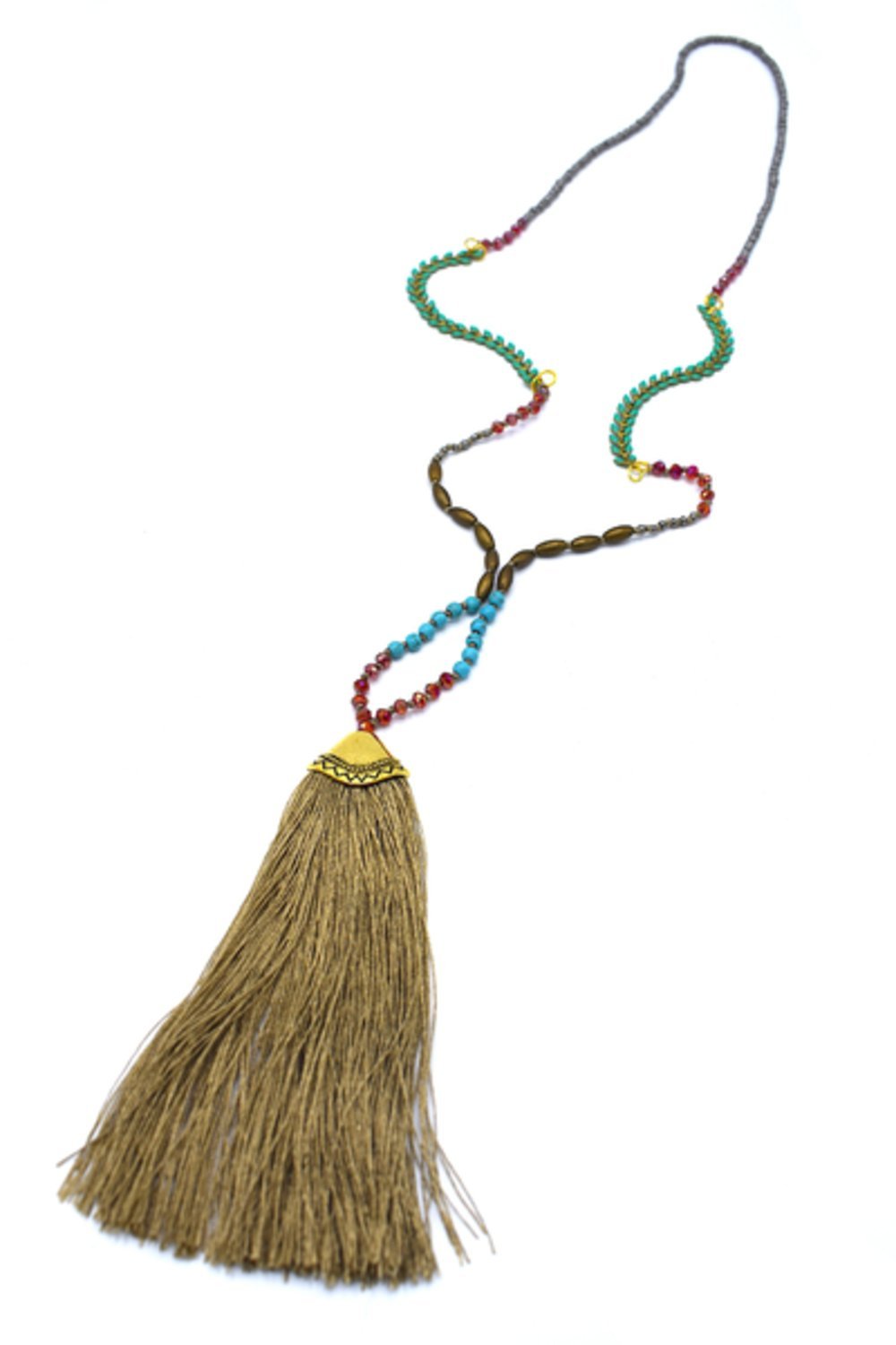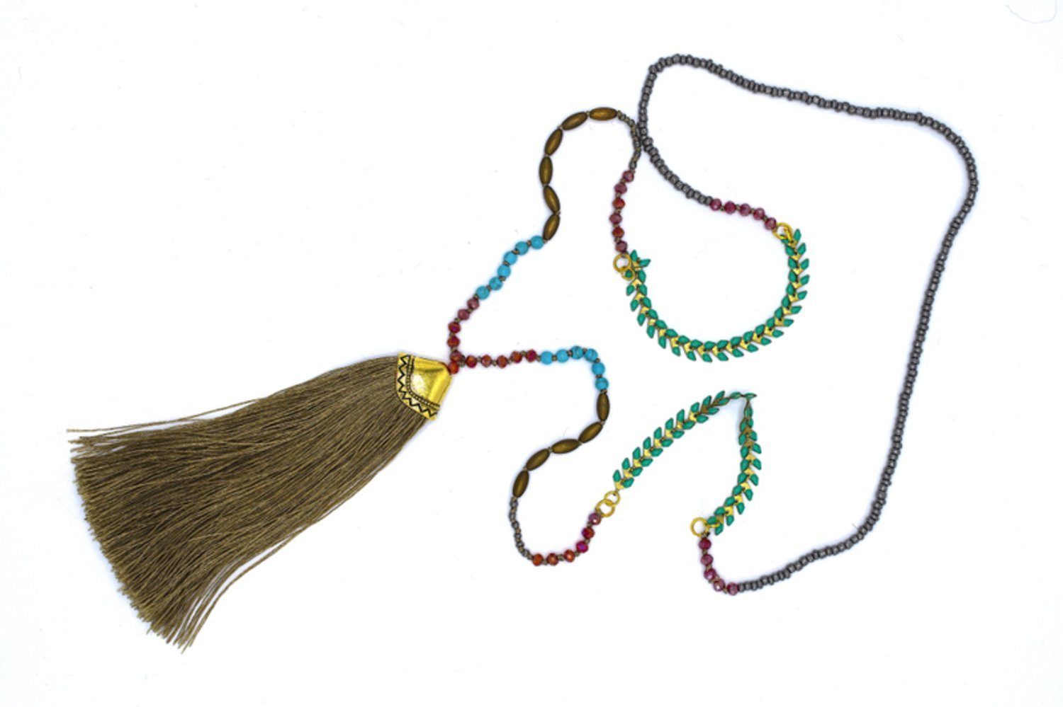 Långt halsband med flera olika färgglada pärlor och ett snyggt hänge med fransar.