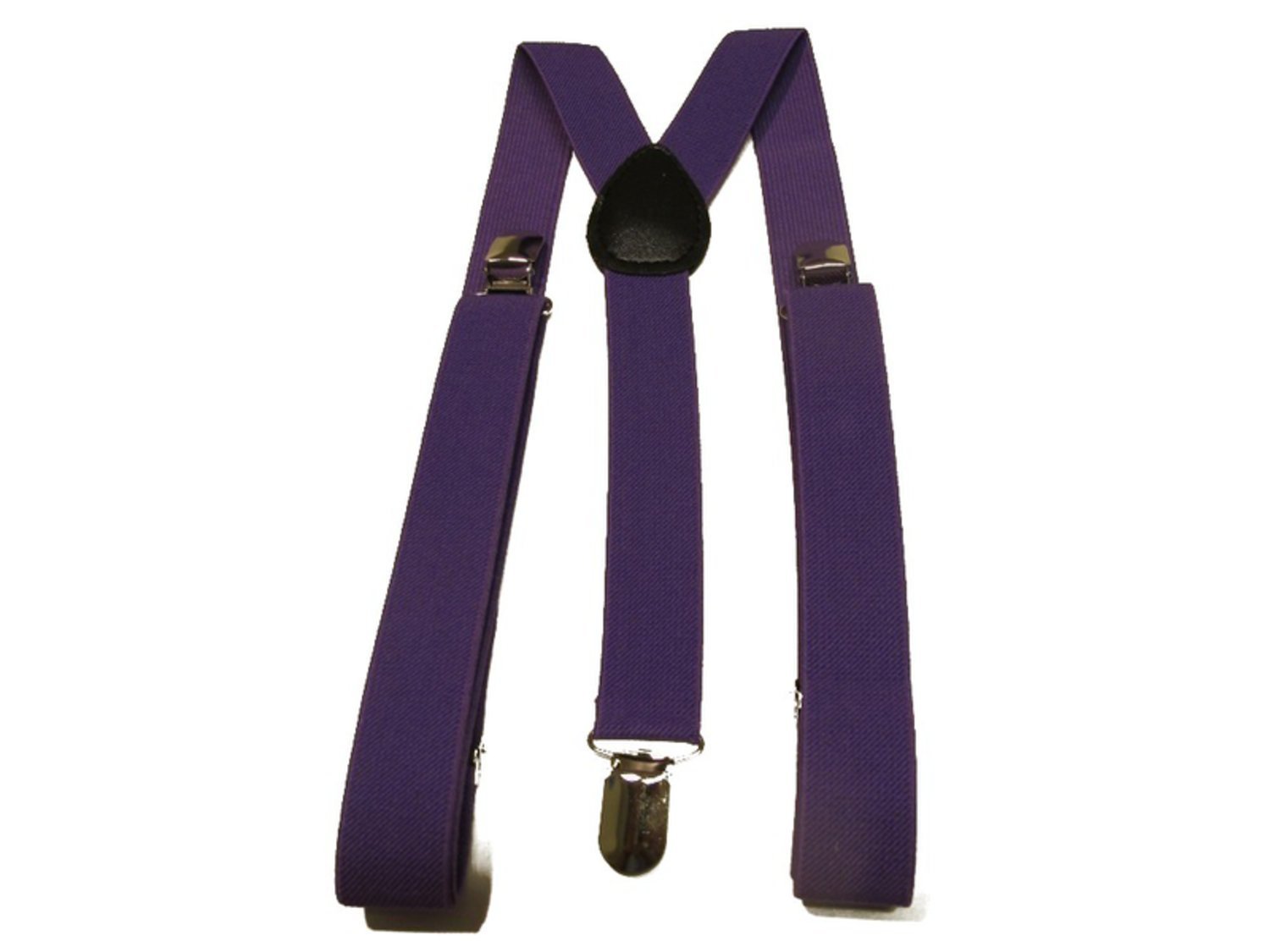 Hängslen i elastiskt tyg. Hängslena har justerbar längd och fästs i byxorna med starka, silverfärgade spännen.