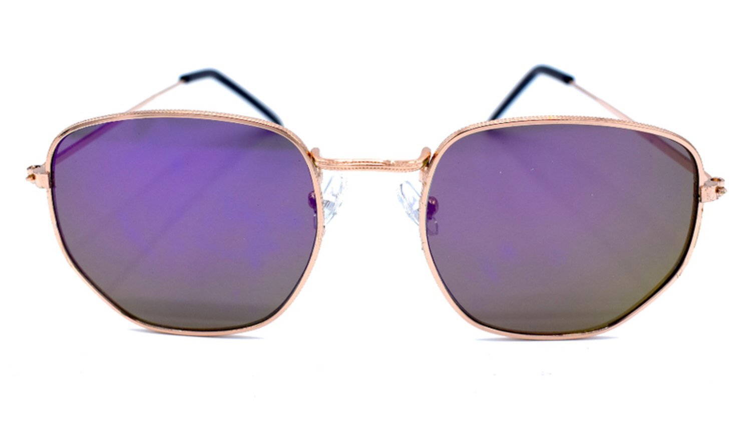 Solglasögon med guldfärgade bågar och lila linser från märket KOST. (Färgen på linsen skiftar lite från solljuset)