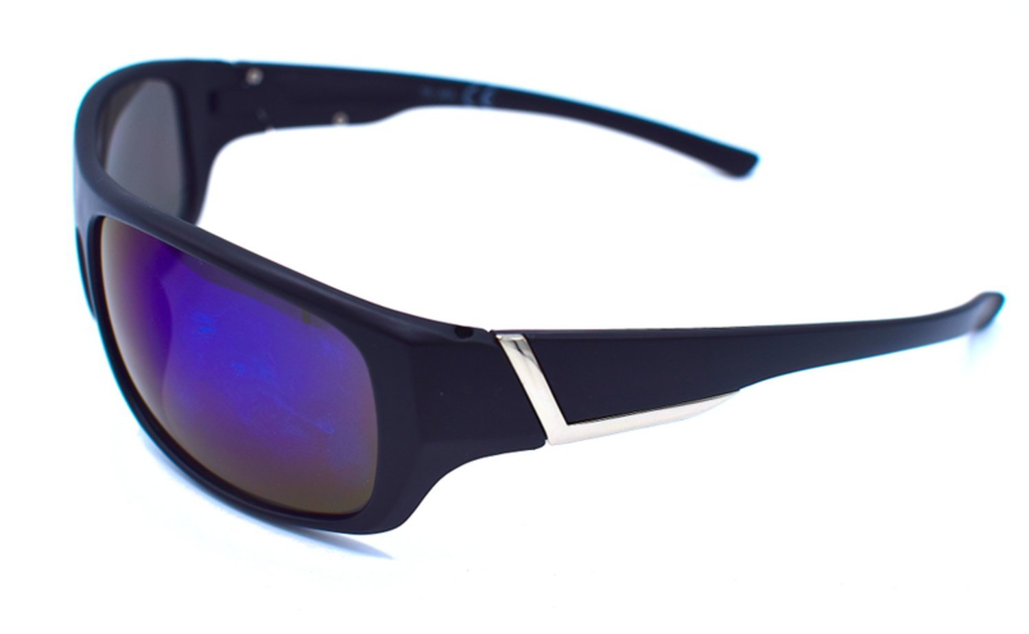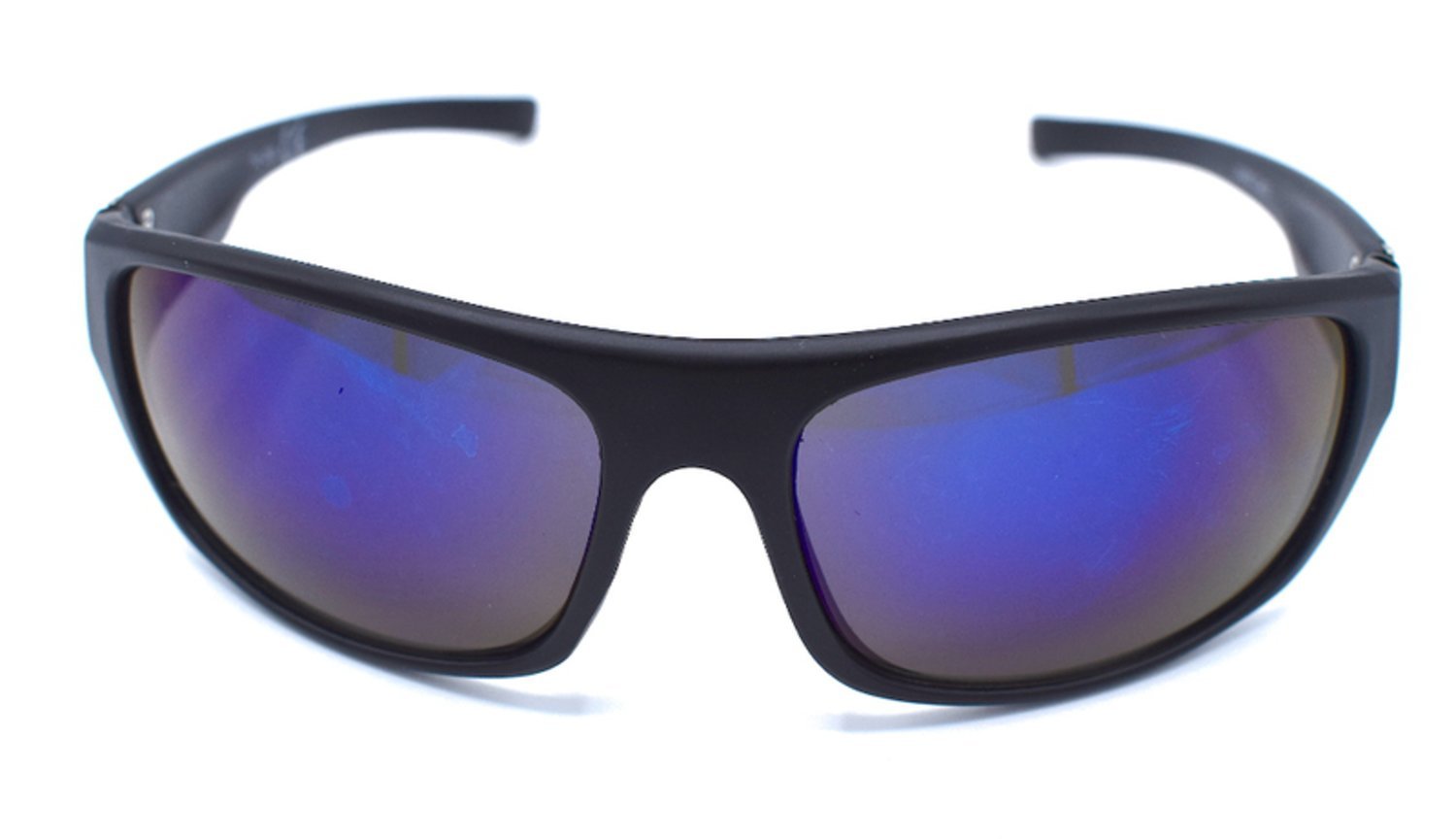 Sportiga Solglasögon med svarta bågar och blåa linser från märket Kost.