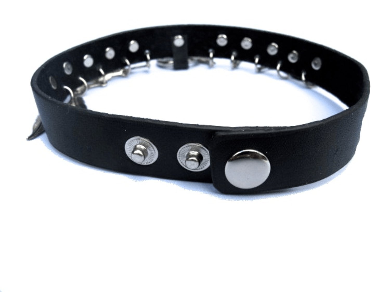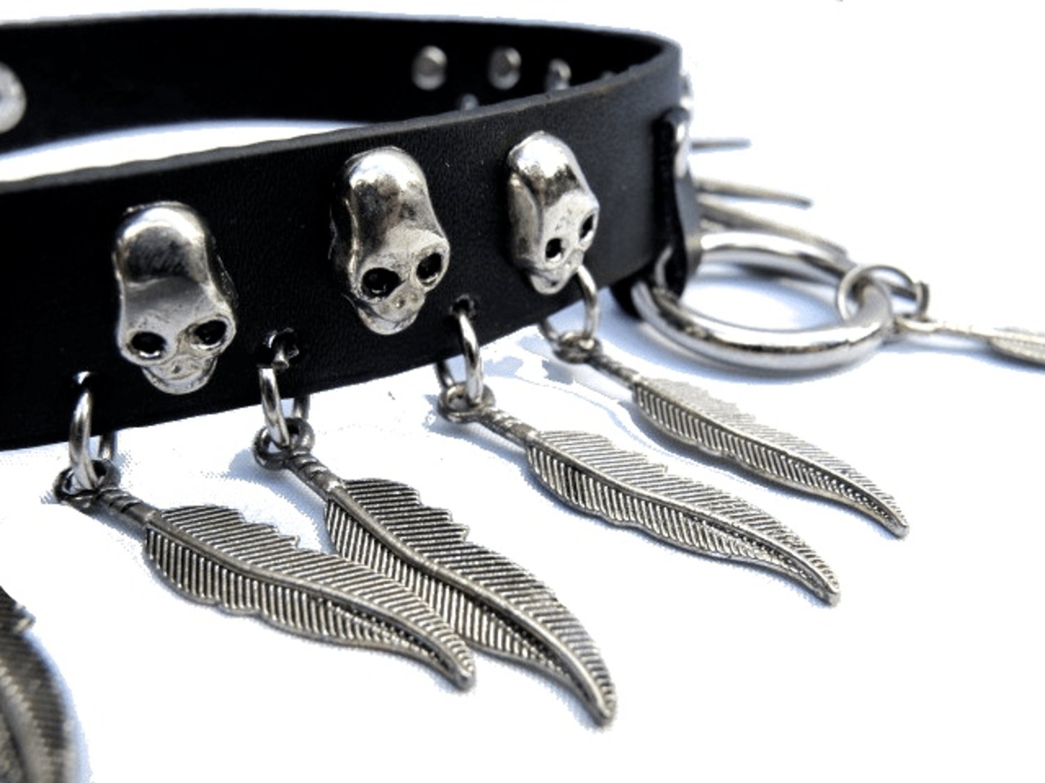 Svart läderhalsband med silverfärgade döskallar, fjädrar och ring.