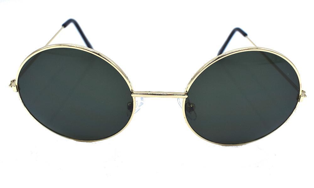 Runda solglasögon med guldfärgade bågar och mörkgröna linser.