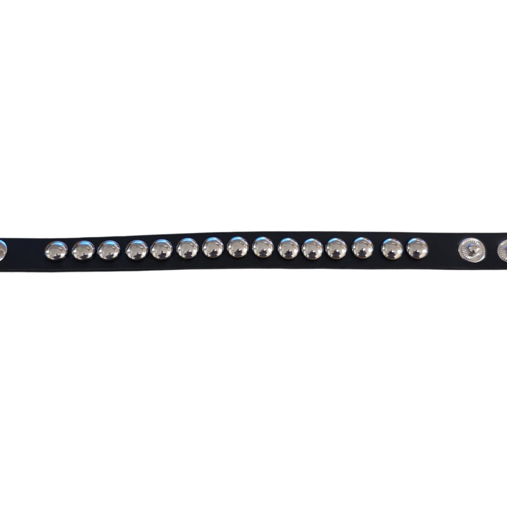 Snyggt och rockigt svart läderarmband med blanka silverfärgade nitar runt hela bandet. Armbandet är ca 2 cm brett och 23 cm långt, med flera tryckknappslägen för enkel justering så att det passar de flesta handleder. En perfekt accessoar för en edgy stil, både till vardags och på fest.