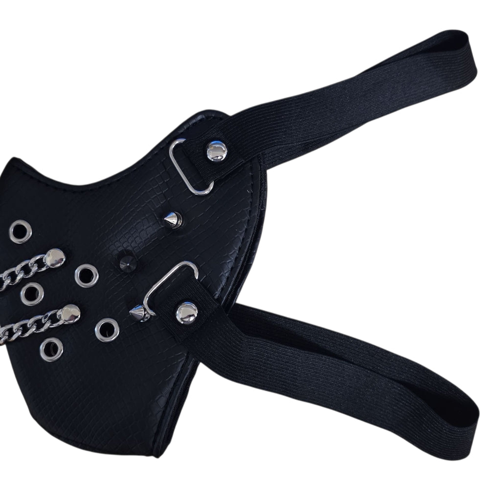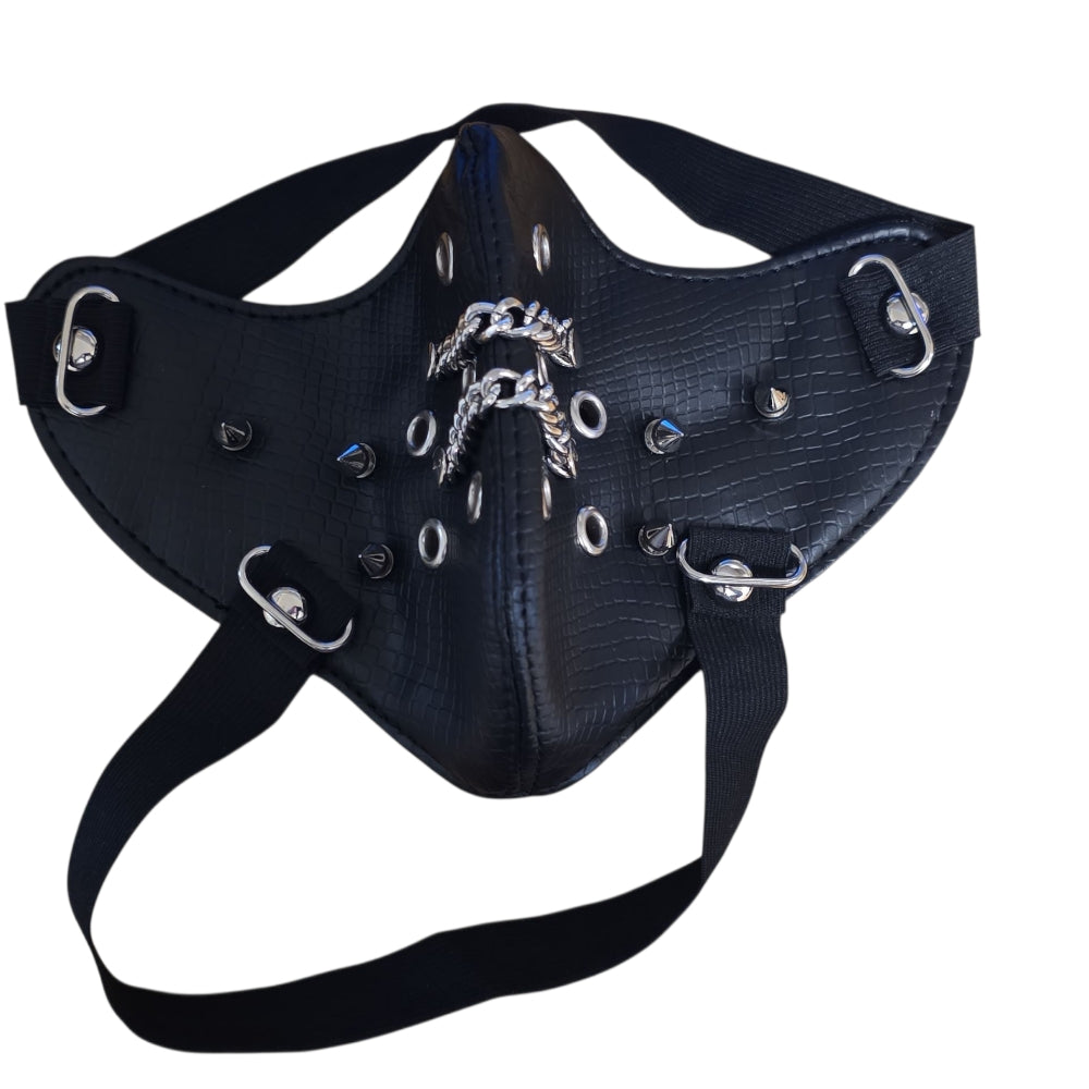 Mask i svart konstläder med präglad reptilstruktur. Fronten pryds av tre kedjor, stora öljetter och konformade spikes på sidorna. Justerbara remmar och mjuk insida ger stabil och bekväm passform. Perfekt för cosplay, scen, festival och fotosessioner.