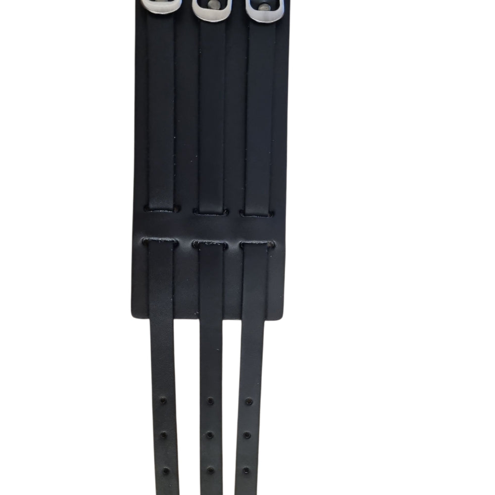 Tufft och stilfullt armband i svart konstläder med tre justerbara remmar och metallspännen. Den breda designen ger en kraftfull look som passar perfekt för rock, punk eller alternativ stil. Armbandet är bekvämt att bära och enkelt att justera för optimal passform.