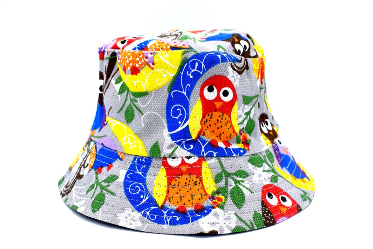 Fiskarmössa med färgglada ugglor som motiv, vändbar för svartfärg.